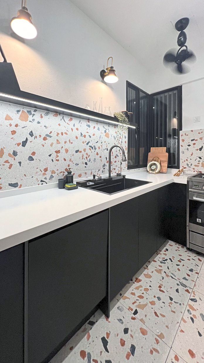 这对夫妇决定采用水磨石图案的陶瓷瓷砖,因为它不滑,耐油。使用相同的瓷砖,他们将其与后挡板相匹配。