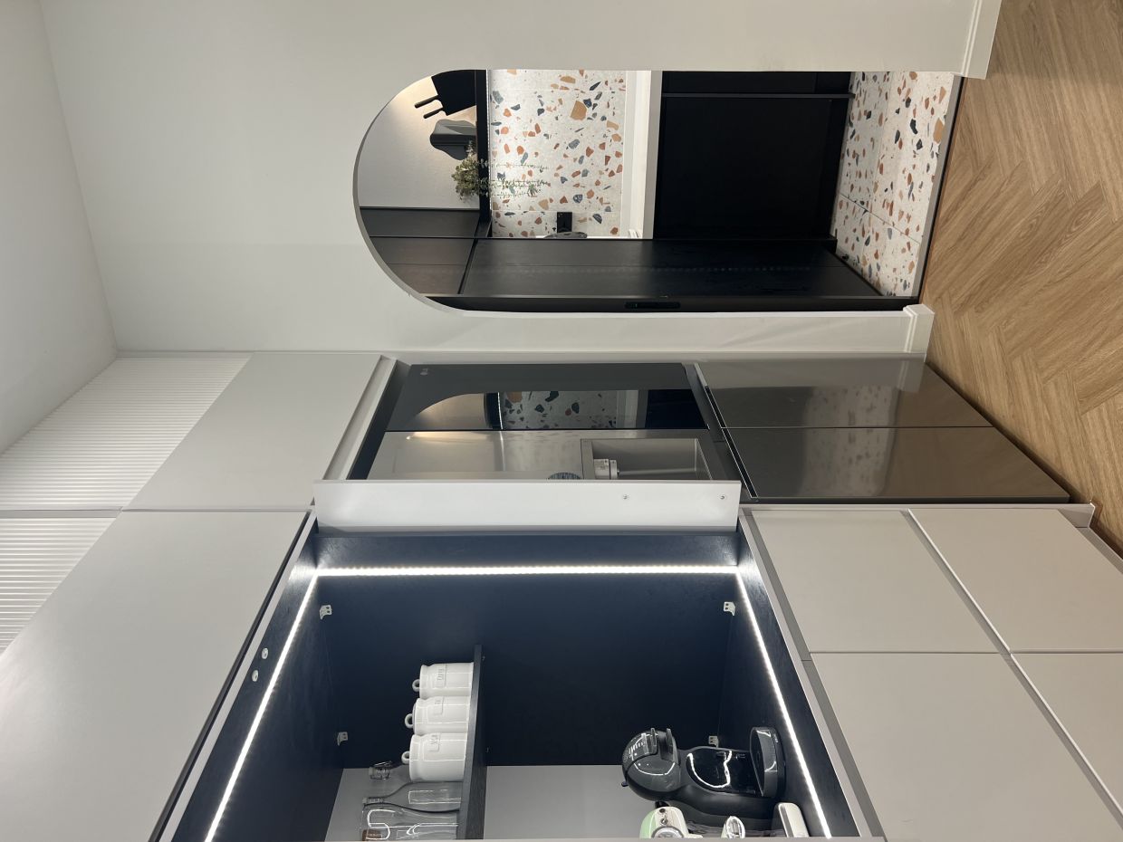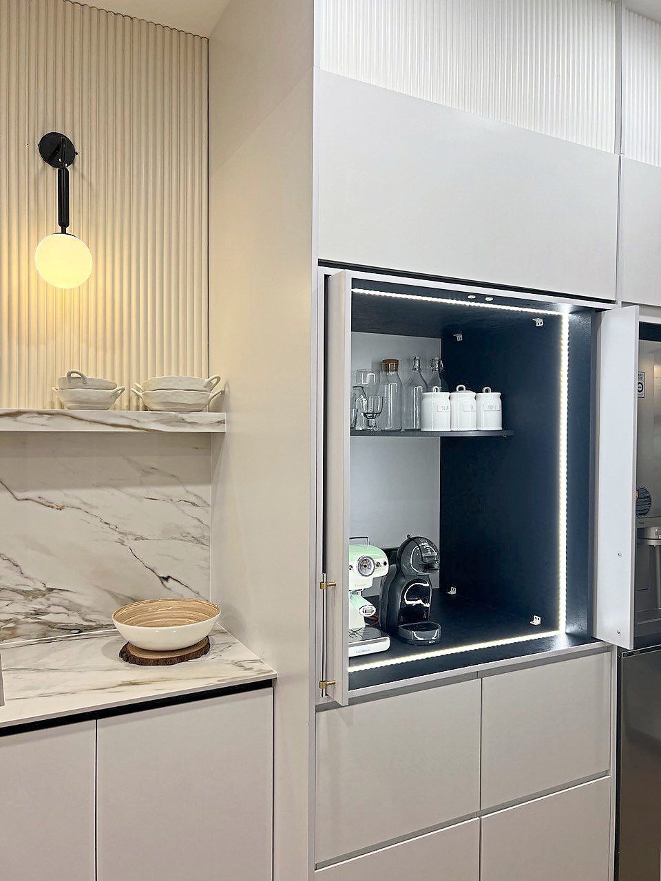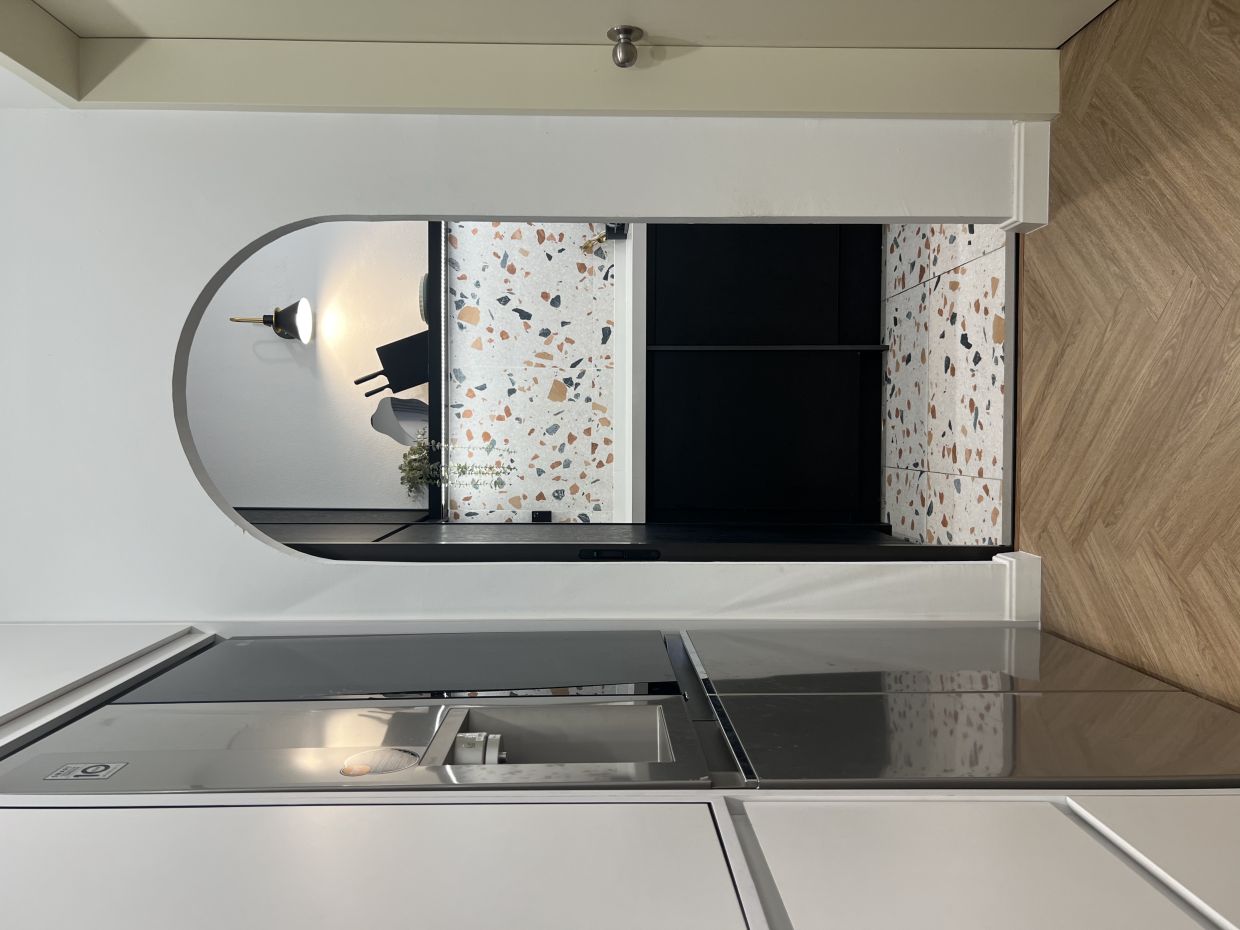 “对于干燥的厨房,我们选择了SPC人字形地板。人字形的好处是,它会使一个小空间看起来更长更大。我们的干厨房不像湿厨房那么笨重,所以选择与其他空间相匹配的地板使用餐区和干厨房看起来无缝和开放。”Shasha说。
